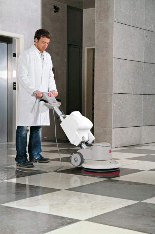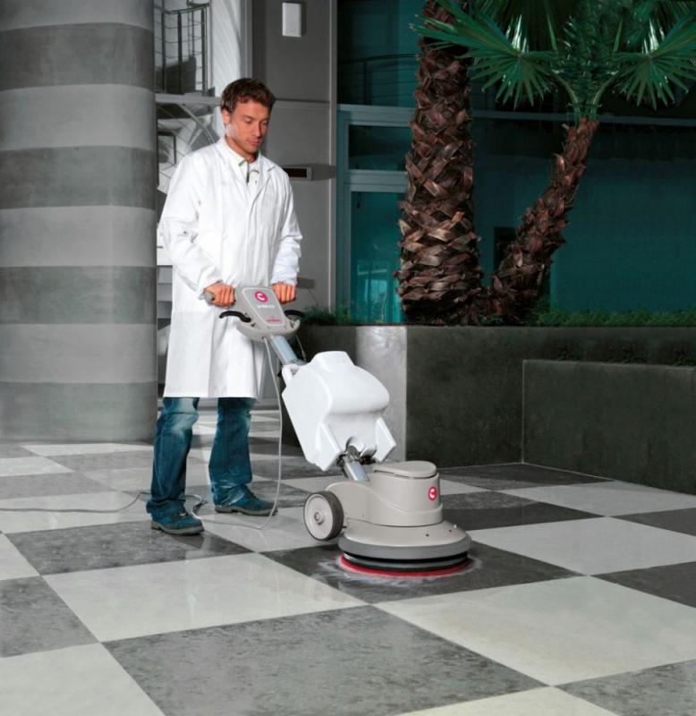 En elektrisk polermaskin. Med en hög uthållighet passar denna maskin bra för noga utförda städningar, bäst på betong- och vinylgolv.
